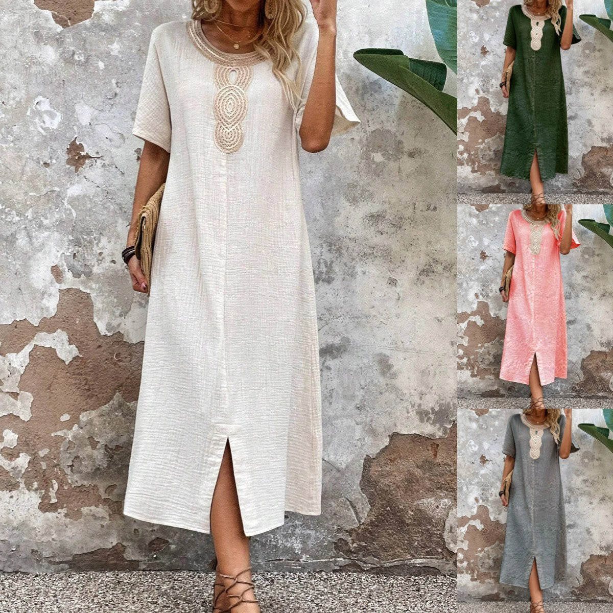 Damska sukienka z bawełny i lnu z okrągłym dekoltem i długą spódnicą